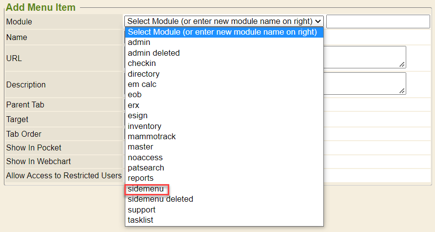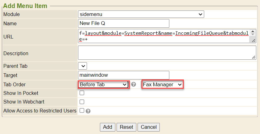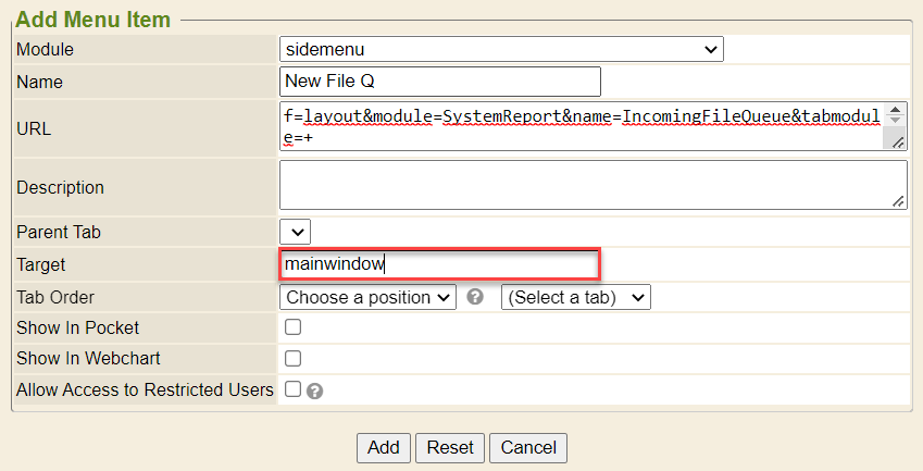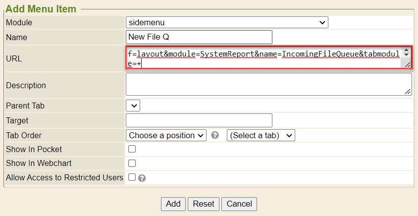 - Add the URL - ?f=layout&module=SystemReport&name=IncomingFileQueue&tabmodule=+