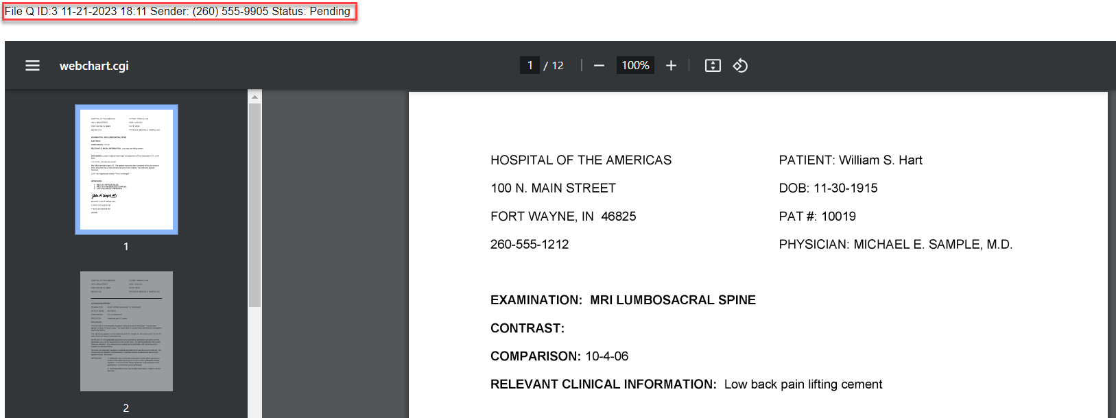 - In the new window, at the top of the screen, summary information displays. The summary includes the File ID, Date and Time it was created in the queue, the Sender’s fax number, and the status.