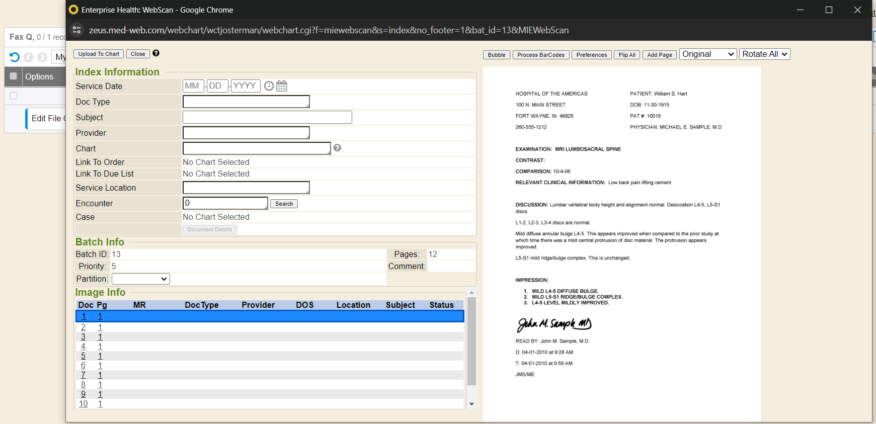 The File/Fax Queue allows for viewing/indexing of incoming faxes. Within the module, a file can be previewed or opened, tasks generated, file sent to a new user or department, or indexed directly within the queue or WebScan. This module has recently been updated to now include additional information when opening the file. When a user opens the file, they will see a summary of that document. The summary includes the File ID, Date and Time it was created in the queue, the Sender’s fax number, and the status. When a user hovers over this information, a set of shortcut icons are displayed. The icons will be reviewed in the Documentation section. The File/Fax Queue is a feature that can be added or upgraded for an additional cost.