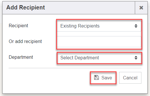 - Select a Recipient or add a recipient and then select the department that will be mapped. Click the “Save” button.