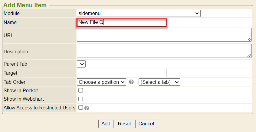 - Click on the Tab Order drop downs to set where the New File Q option will be located on the sidemenu