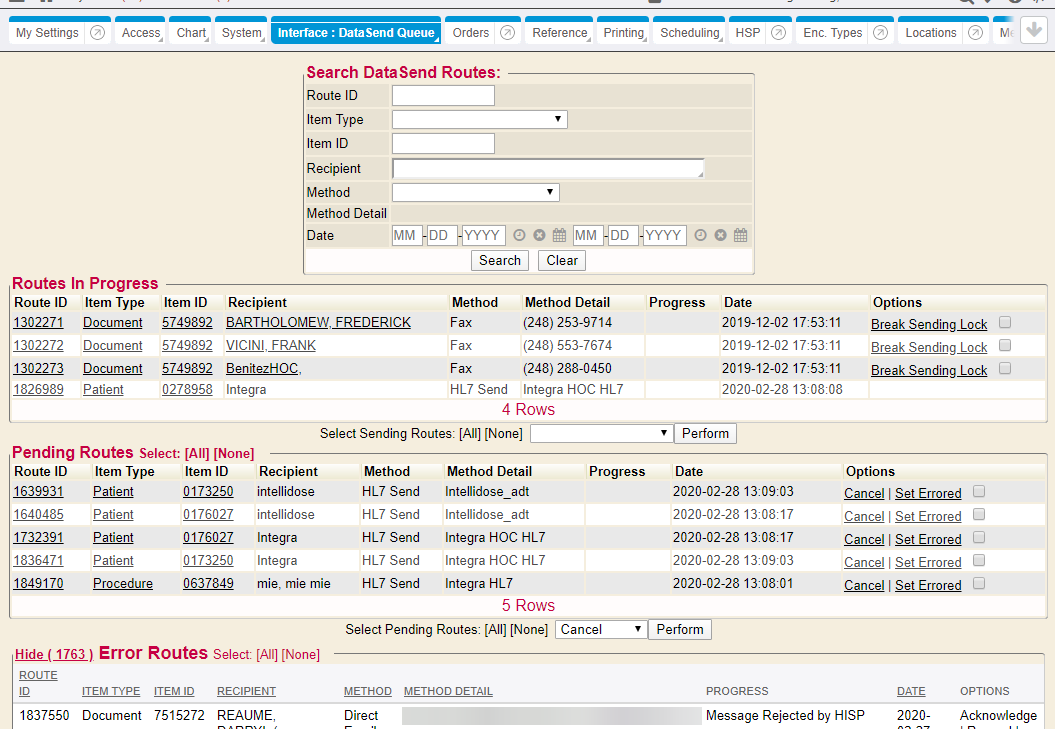 Once records are added into Webchart and the triggers are satisfied, the HL7 message should send out according to the RTS. To validate that the data was sent outbound successfully, browse to the DataSend Queue in Control Panel -> Interfaces.