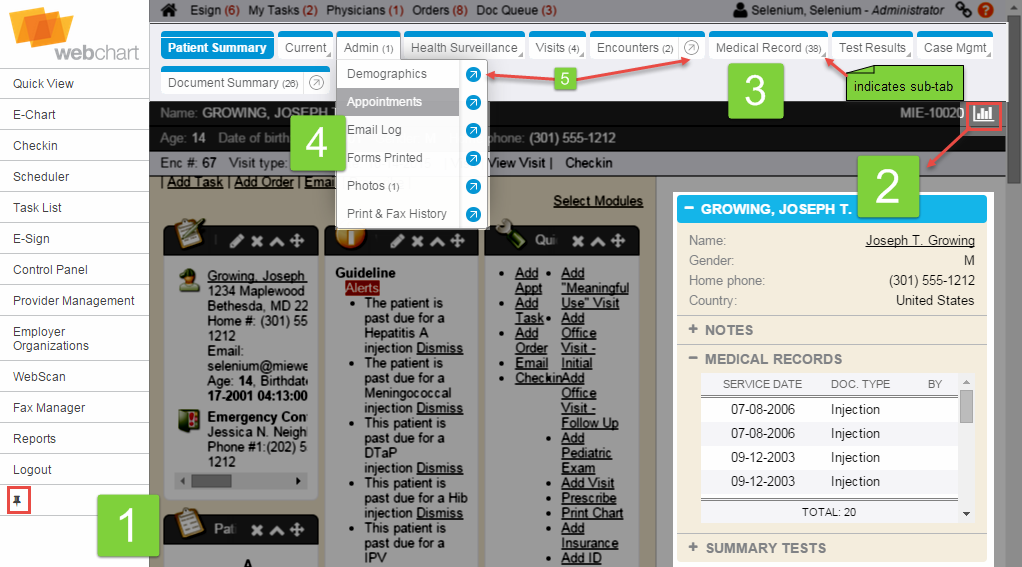 1. Side chart icon: Opens the side chart when working in an encounter. Displays pertinent patient information (demographics, notes, medical records, orders/tests, comments) on the right side of the page.