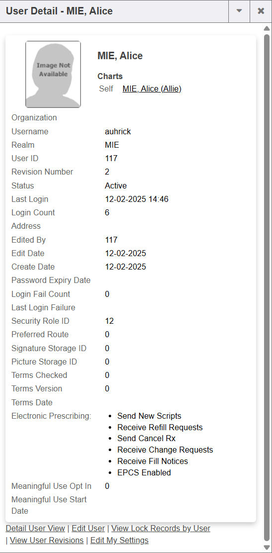 1. The logged in user’s name and security role will display to the right of the person icon. If the logged in user has access to edit user profiles, the name becomes a clickable link that takes the end user to the user account information. Beginning with RC202603, the User Detail box has been updated to display Eprescribe feature enrollment statuses and Meaningful Use (Quality) opt-in status and start dates.